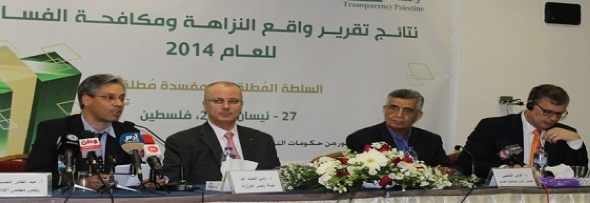 رئيس الوزراء دكتور رامي الحمدالله قال في كلمته التي القاها بمناسبة مؤتمر اطلاق تقرير الفساد السنوي ان تقرير الفساد هو خطوة هامة من اجل الاضاءة على الجوانب التي تحتاج لمعالجات كما اكد رئيس الوزراء نية الحكومة الانفتاح على الجهات الرقابية المختلفة، وان كافة المؤسسات الرسمية الوزارية وغير الوزارية هي عرضة للمساءلة والرقابة، بما فيها المؤسسات الرسمية الرقابية نفسها.